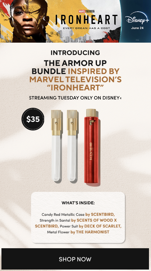 In this Summer’s Disney+ premiere of Ironheart, Marvel’s much-anticipated spinoff featuring tech genius Riri Williams, the Scentbird’s “Armor Up” Bundle campaign wasn’t a themed afterthought. It was a precise, layered, and cross-platform strategy designed to create emotional resonance.