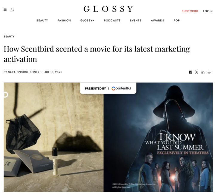 Glossy called out Scentbird’s commitment to “multi-sensory, enhanced entertainment,” applauding the addition of “an olfactory layer” that turned a typical screening into a full-body experience. Variety highlighted the campaign’s creative depth, pointing to the fragrance set’s inclusion of cult-favorite brands like Arquiste, Mancera, and Commodity, cleverly packaged in a fishnet pouch as a nod to the film’s coastal horror vibe. Over at Fangoria, the activation was described as giving “horror fans the chance to smell like a slasher sequel,” with each scent carefully mapped to a mood or moment in the storyline. Together, these features didn’t just report the launch, they amplified it; cementing Scentbird’s role as a leader in experiential marketing and showcasing how scent can be a powerful vehicle for narrative, not just a beauty buy.